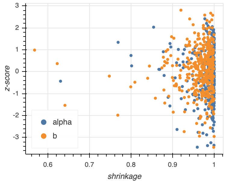 To graphically assess the shrinkage and z-score, we typically make a shrinkage vs. z-score plot. Each point in the plot represents the results from one of the \(N\) data sets drawn from the generative model. A typical shrinkage vs. z-score plot for a model with two parameters \(\alpha\) and \(b\) is shown below.
