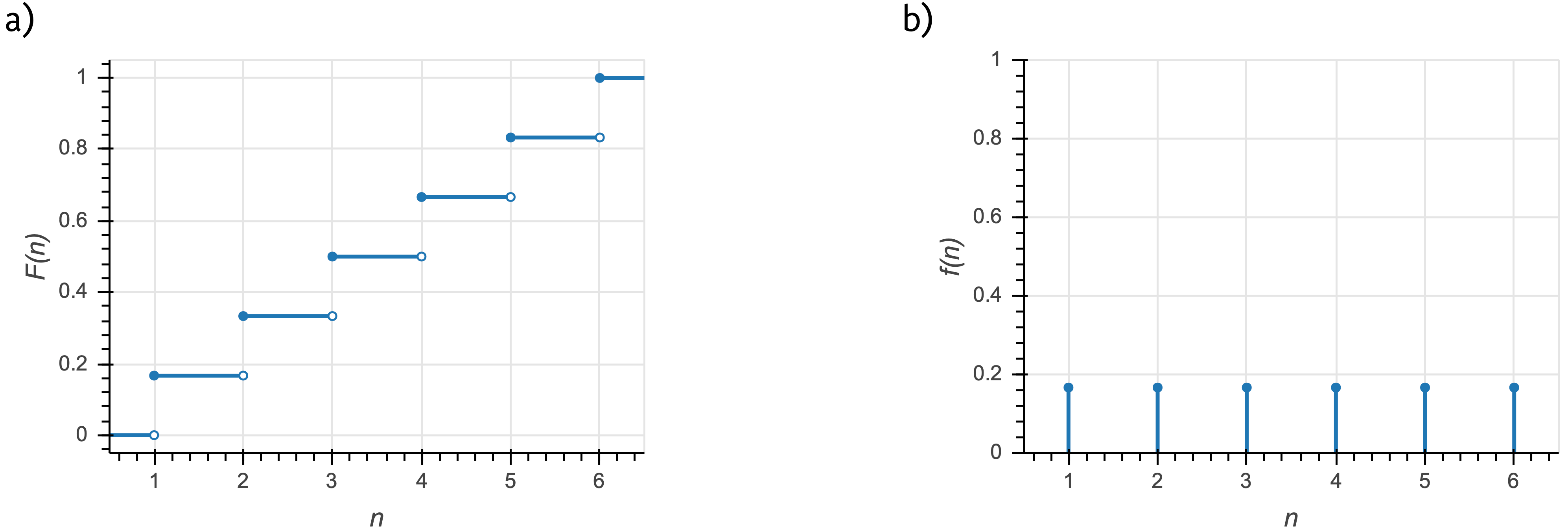 The PMF is a probability, unlike the PDF. An example of a CDF and a PMF for a discrete distribution are shown in the figure below. In this example, \(n\) is the outcome of the roll of a fair die (\(n\in\{1,2,3,4,5,6\}\)).